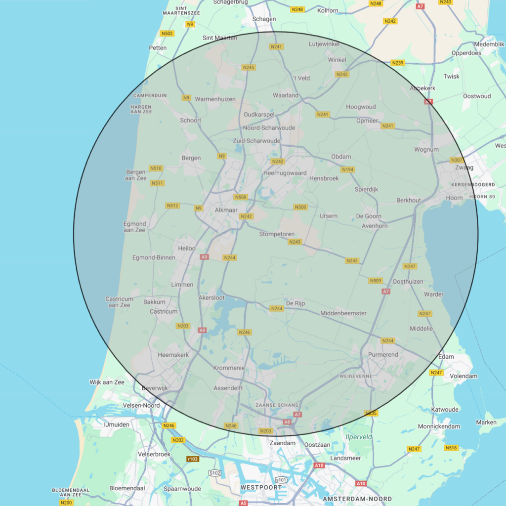 Ons vaste werkgebied ligt binnen een straal van circa 20 km rondom Alkmaar en Heerhugowaard.